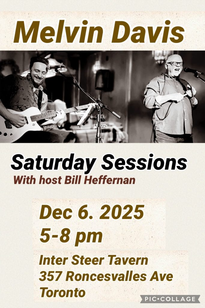 Shows Melvin Davis in Toronto on 12/06/25 by info@robertdavis.biz|Published November 29, 2025 Related show Artist: Melvin Davis Date: 12/06/25 Time: 5:00pm Venue: Inter Steer Tavern City: Toronto , ON Address: 357 RONCESVALLES AVE Venue phone: 416 588-8054 Country: Canada Notes: Saturday Sessions Matinee Add to Google Calendar|Download iCal